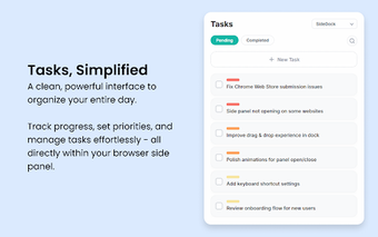 Användare kan enkelt pinna sina favoritwebbplatser och använda AI-verktyg direkt från sidopanelen. SideDock erbjuder även en inbyggd uppgiftshanterare för att organisera dagliga sysslor, samt en anteckningsfunktion för att snabbt fånga idéer. Med en integrerad Pomodoro-timer och en väderwidget är detta tillägg en komplett lösning för dem som vill maximera sin produktivitet i webbläsaren.